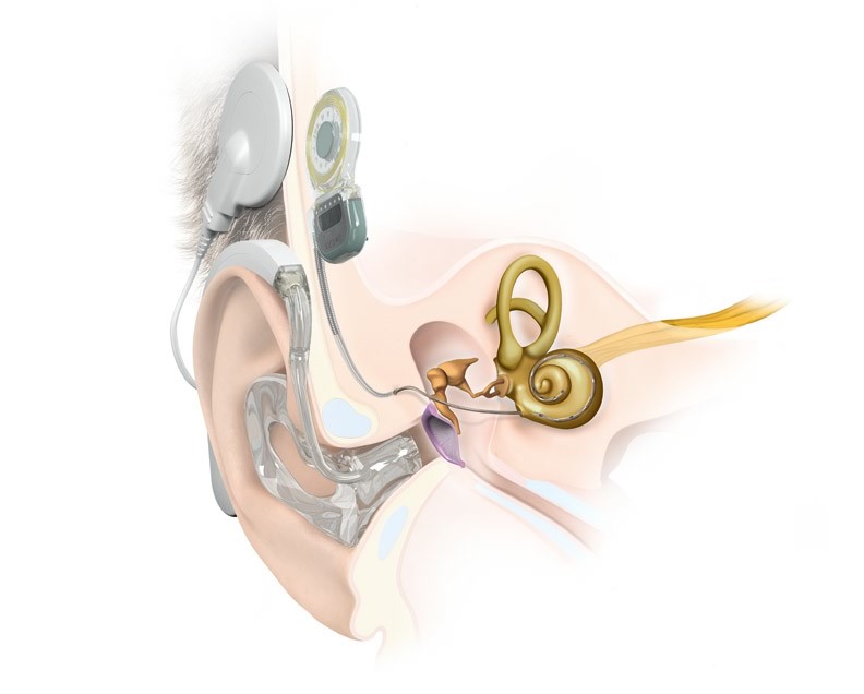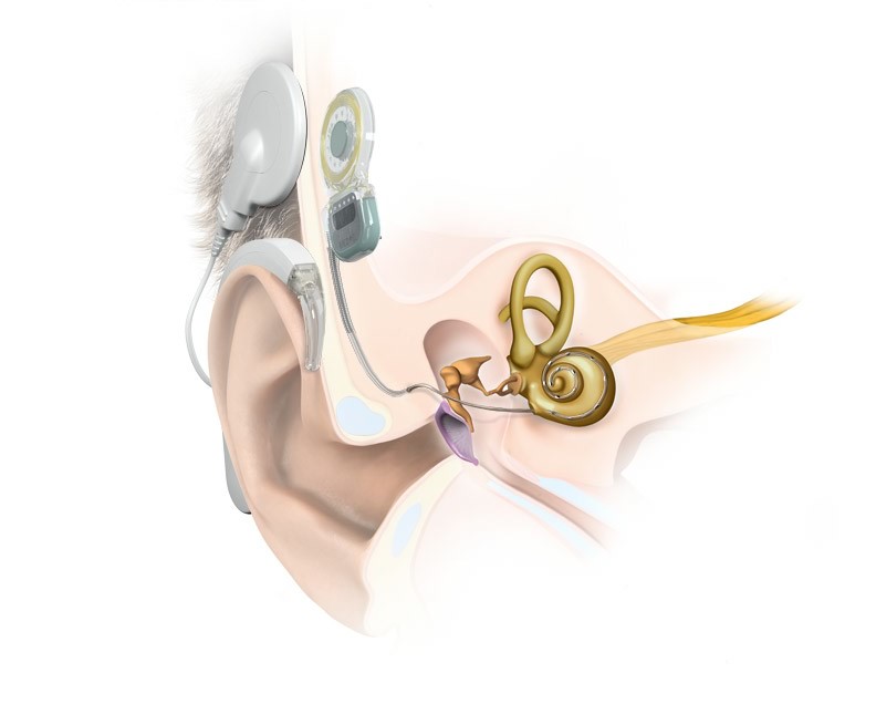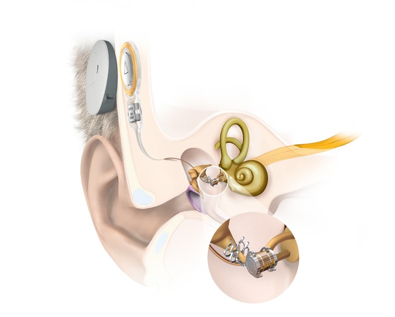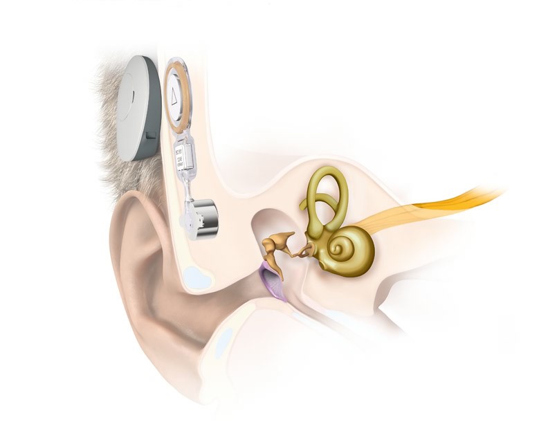 อุปกรณ์ผ่าตัดฝังจะถูกยึดอยู่กับกระดูกใต้ผิวหนังบริเวณศีรษะช่วงหลังใบหู ซึ่งจะมีแม่เหล็กที่ทำหน้าที่ในการยึดติดกับเครื่องประมวลเสียงที่อยู่ภายนอก